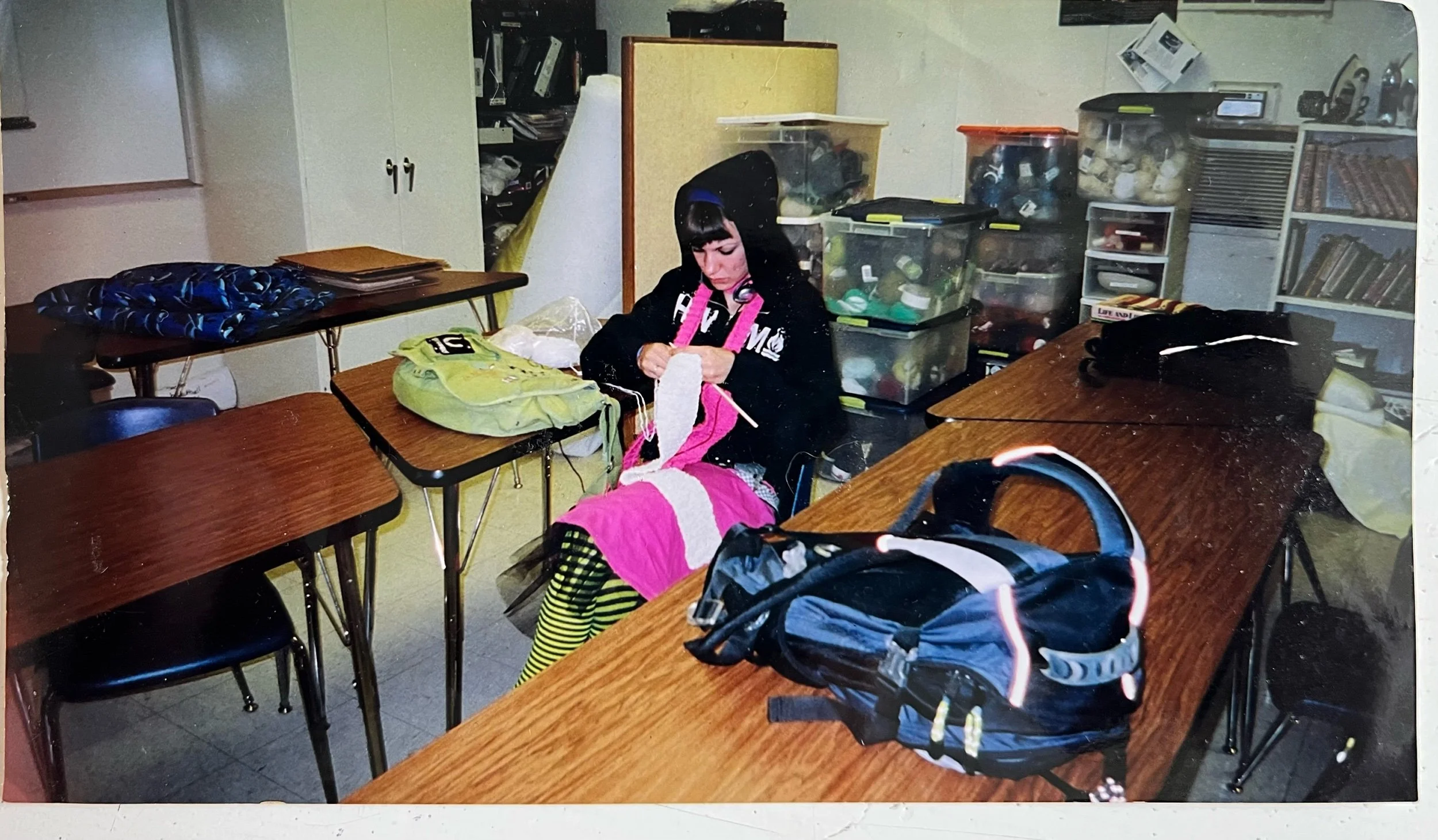 Knitting in the sewing room that was also my theater lit class, my history class and leadership. *continuation high school*