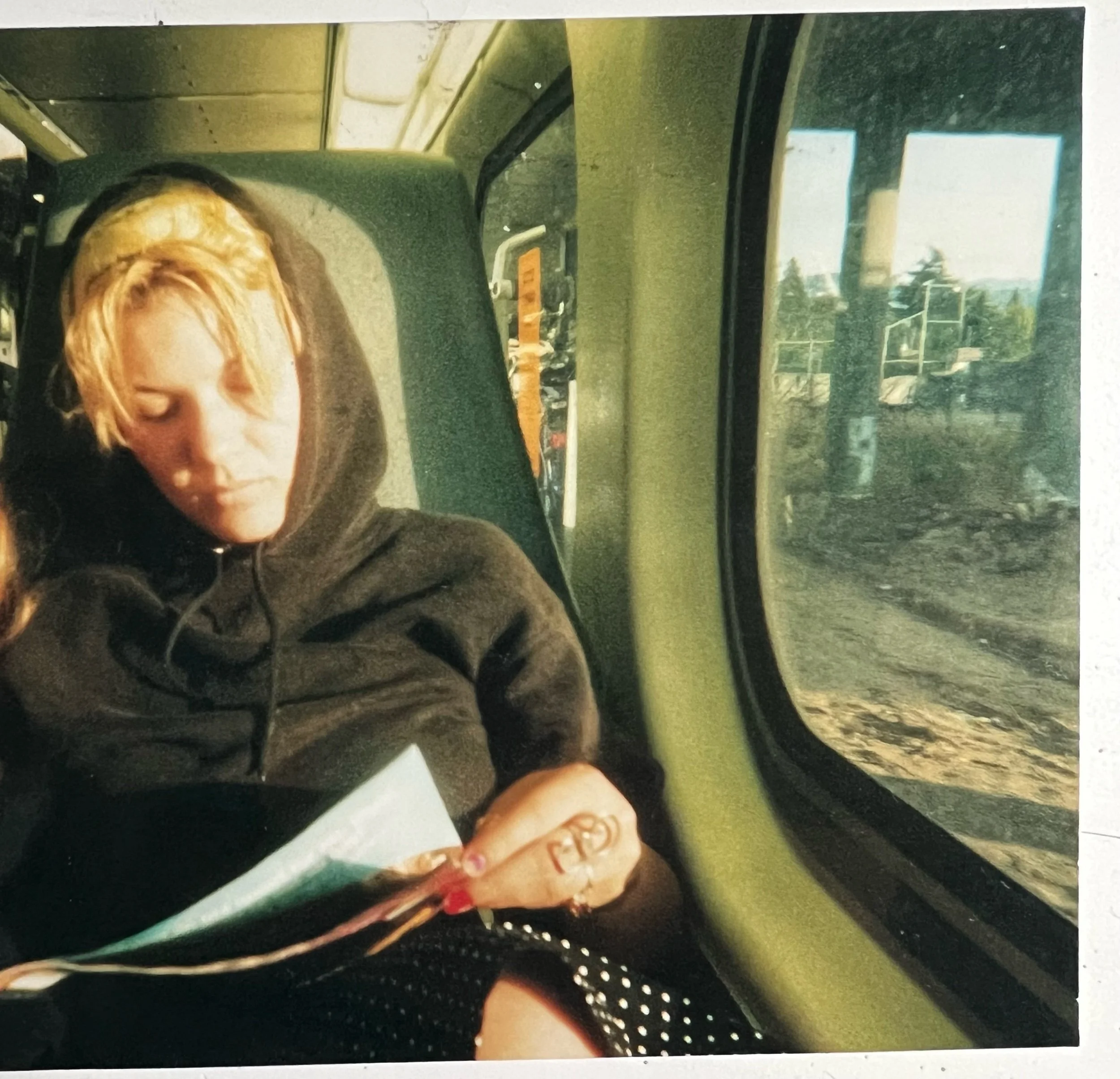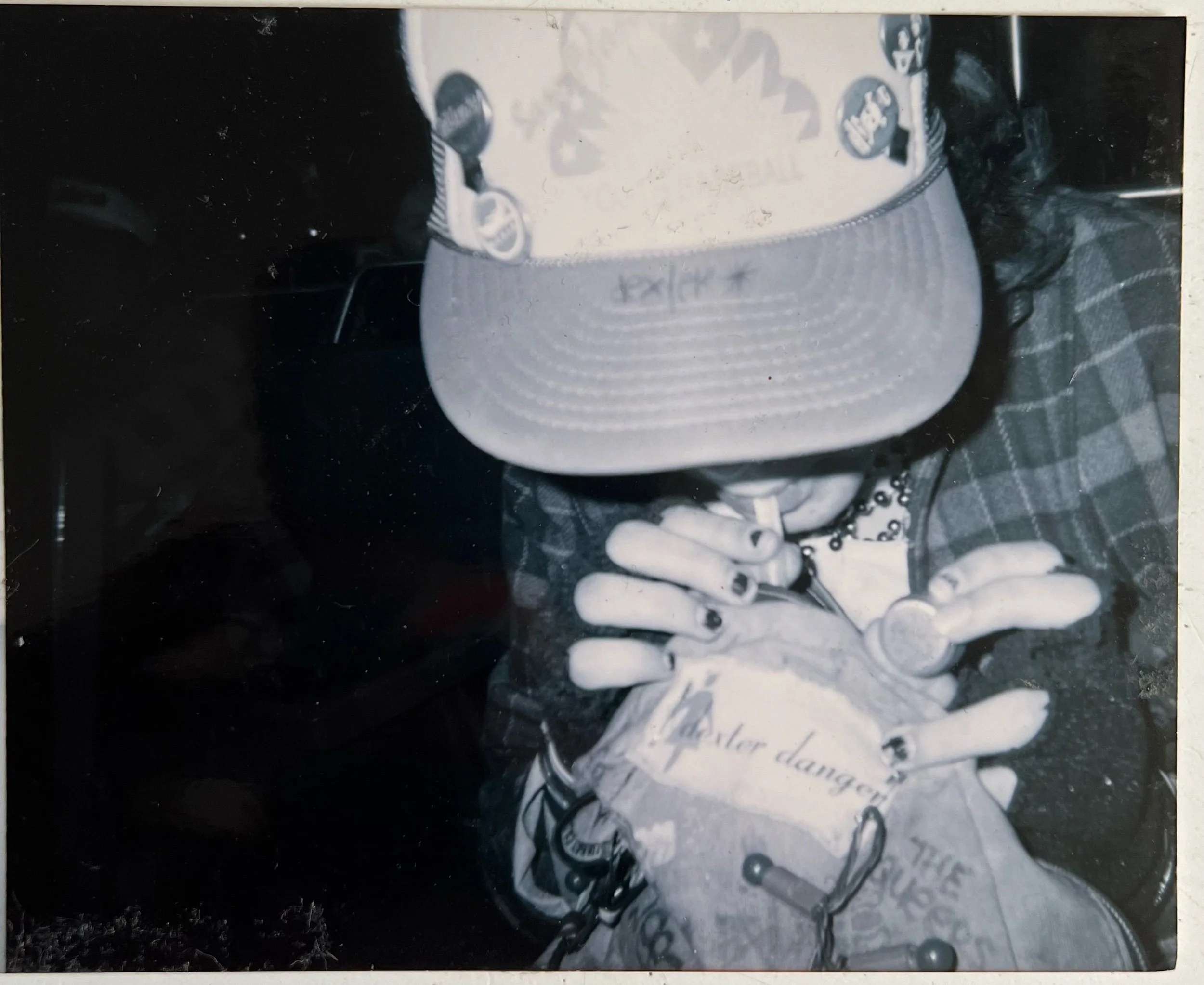The xmas lights on my backpack, mixed with local and mtv band patches paired with a home made Judy Garland patch out of printer paper and scotch tape, safety pinned to the front pocket. ….literally only my journal, cds and batteries for my walkman inside